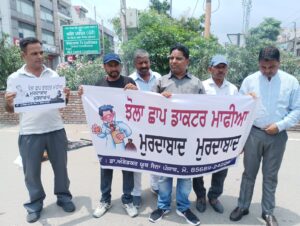 लुधियाना, 20 जुलाई (साथी)। डॉ. अंबेडकर यूथ सेना की ओर से प्रधान राजकुमार हैप्पी और एवं प्रधानमंत्री आवास योजना के पूर्व सदस्य मनोज चौहान की अगवाई में झोलाछाप डाकटर माफिया के खिलाफ पुतला फूंक प्रदर्शन किया गया। अपने संबोधन में उक्त नेताओं ने कहा कि लुधियाना में झोलाछाप डॉक्टरों की संख्या में लगातार इजाफा हो रहा है। अधिकतर डॉक्टरों के पास न तो डिग्रियां है और न ही सेहत विभाग की तरफ से इनकी रजिस्ट्रेशन हुई है। इस संबंध में कई बार सिविल सर्जन को मांगपत्र दिए जा चुके हैं।