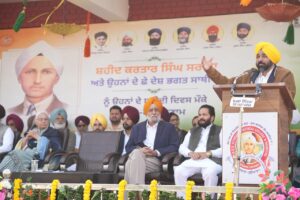 Ludhiana, November 16 (Rajkumar Sathi). Punjab Chief Minister Bhagwant Singh Mann today paid floral tributes to the great freedom fighter Shaheed Kartar Singh Sarabha on his martyrdom anniversary and announced development projects worth Rs 45.84 crore for complete facelift of his native village.Addressing the state-level event, the Chief Minister said that as a mark of respect to the martyr, development works worth Rs 45 crore 84 lakh will be undertaken in Sarabha village to provide basic infrastructure, clean drinking water, sports facilities, defence training, and other amenities. He said that this would be a true tribute to the martyr, adding that the state government will leave no stone unturned to develop this great martyr’s native village as a model village. On this occasion, Bhagwant Singh Mann also paid homage to the companions of Shaheed Kartar Singh Sarabha, Vishnu Ganesh Pingle, Bakhshish Singh, Jagat Singh, Surein Singh (Senior), Shaheed Harnam Singh Sialkoti and Surein Singh (Junior) who were also executed on the same day.